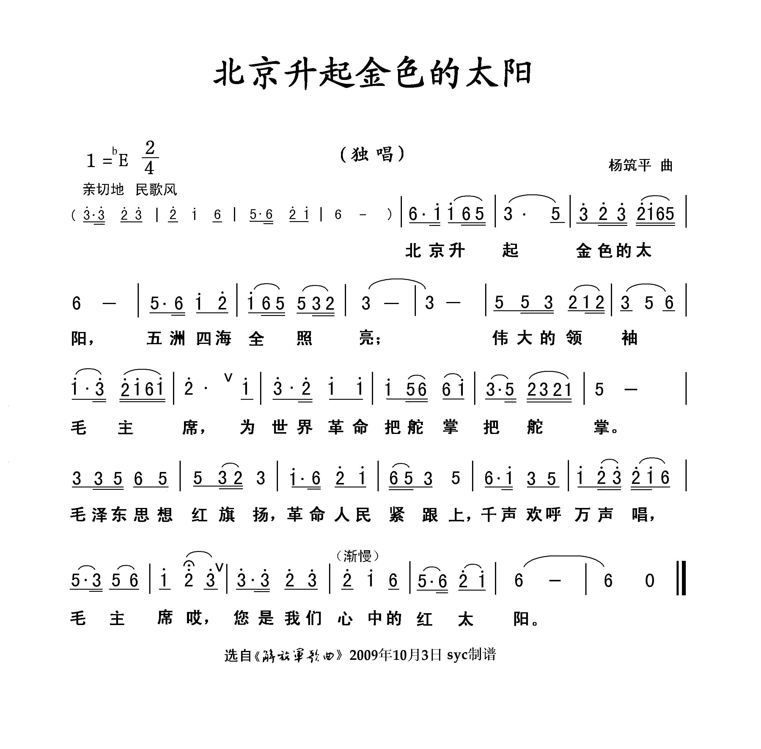 北京升起金色的太阳 简谱 曲谱