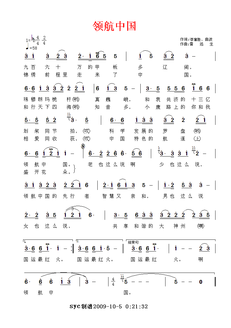 领航中国 简谱 曲谱