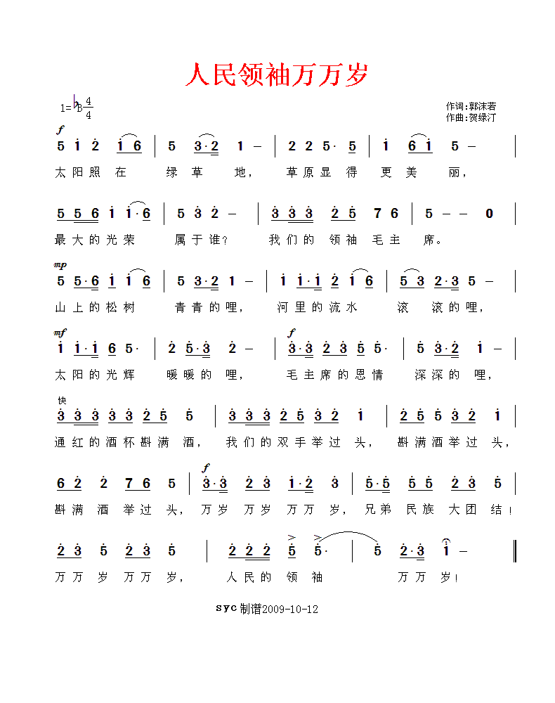 人民领袖万万岁 简谱 曲谱