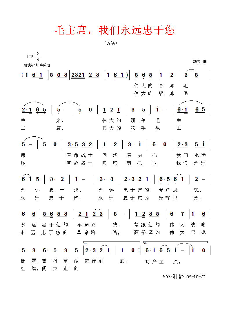 毛主席,我们永远忠于您 简谱 曲谱