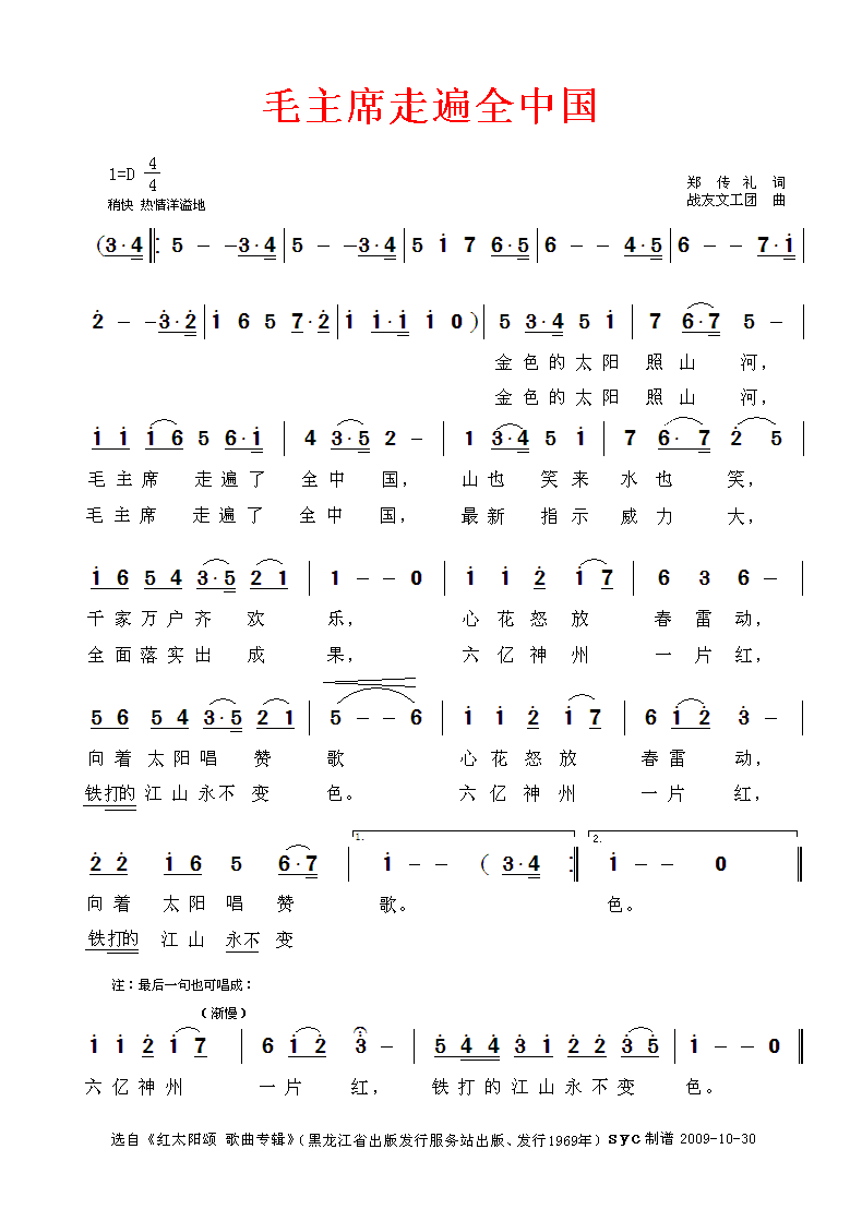 毛主席走遍全中国 简谱 曲谱
