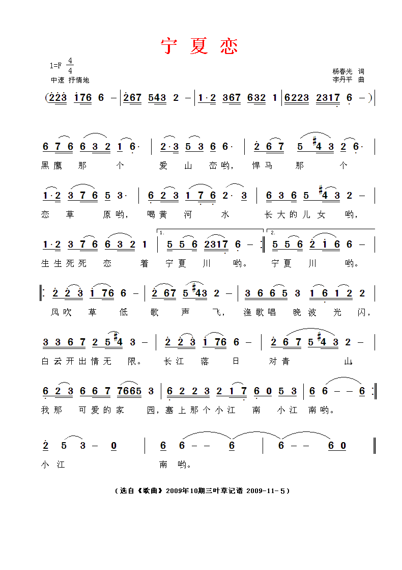 宁夏恋 简谱 曲谱