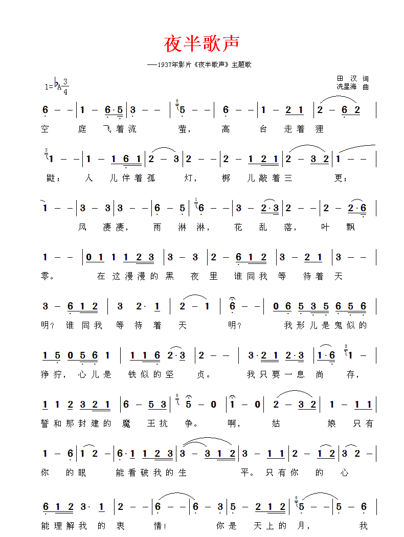 夜半歌声 简谱 曲谱