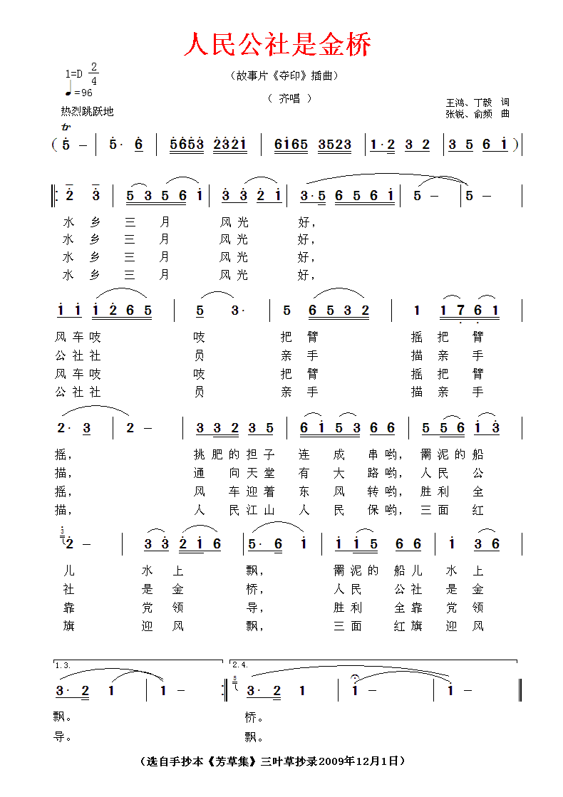 人民公社是金桥 简谱 曲谱