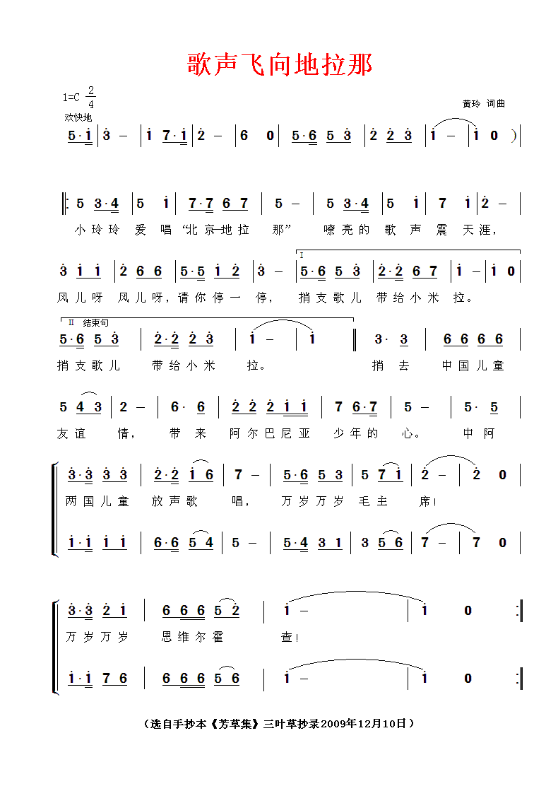 歌声飞向地拉那 简谱 曲谱