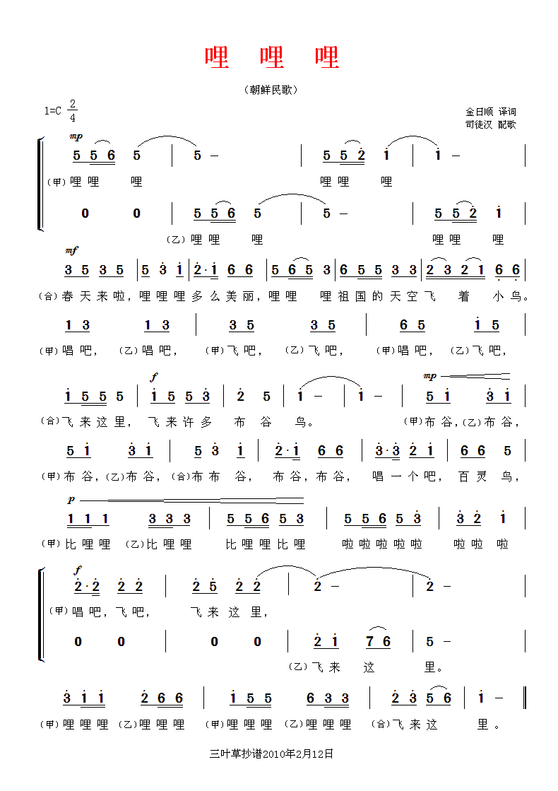 哩哩哩 简谱 曲谱