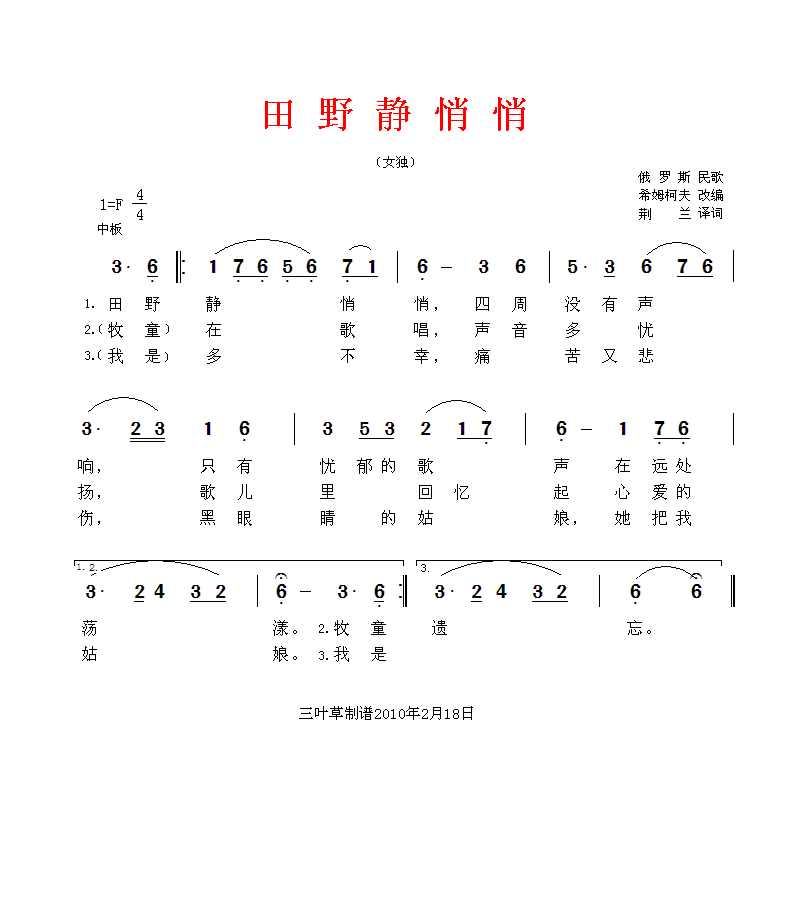 田野静悄悄 简谱 曲谱