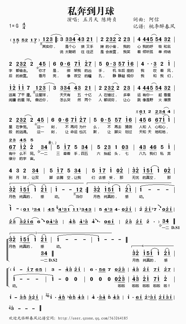 私奔到月球 简谱 曲谱