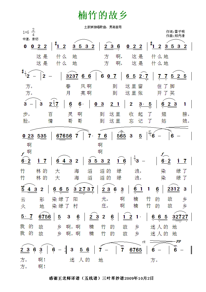 楠竹的故乡 简谱 曲谱