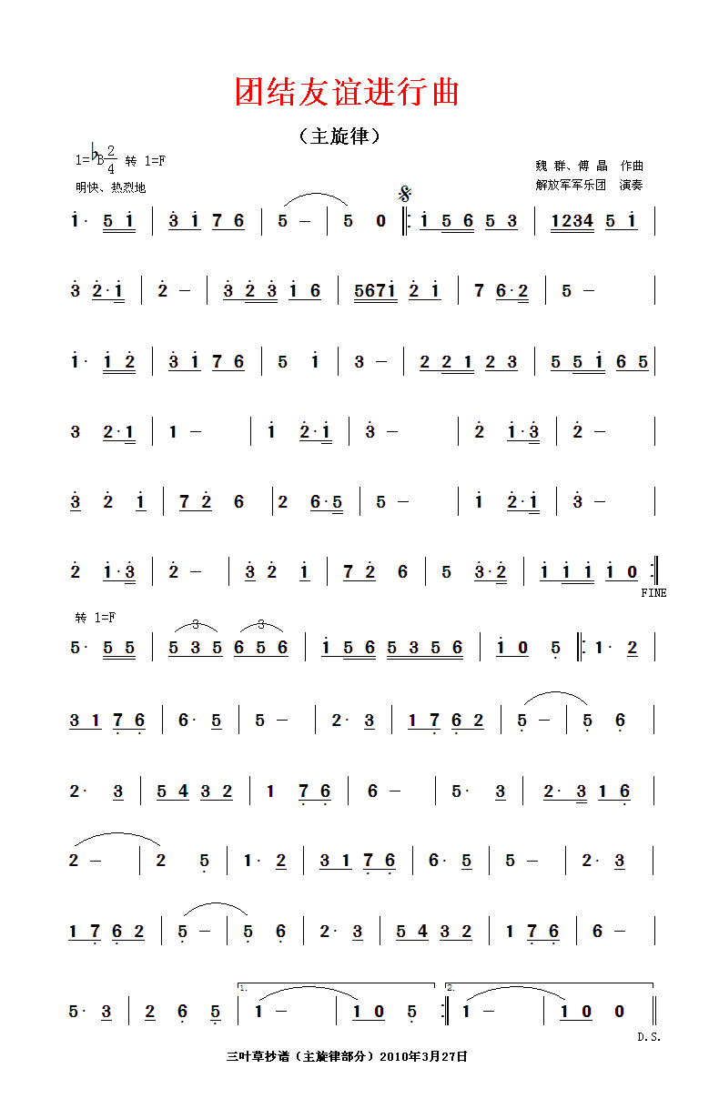 团结友谊进行曲(主旋律) 简谱 曲谱