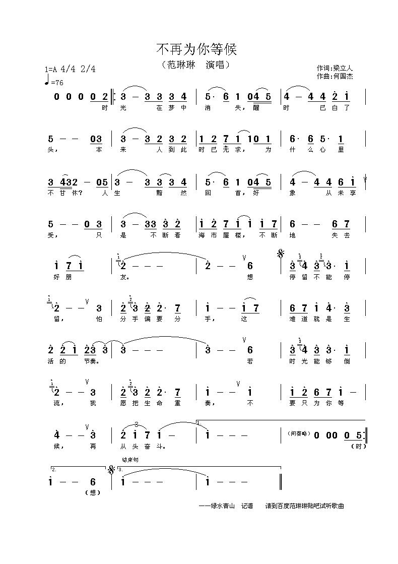 不再为你等候 简谱 曲谱