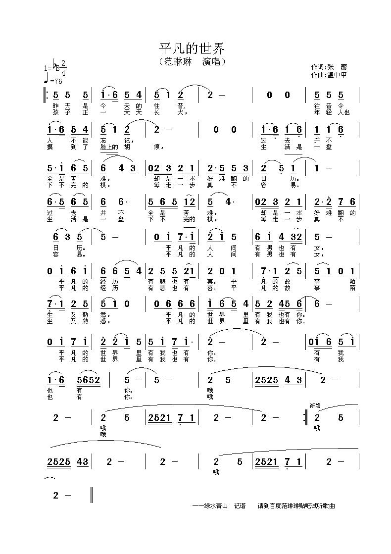 平凡的世界 简谱 曲谱
