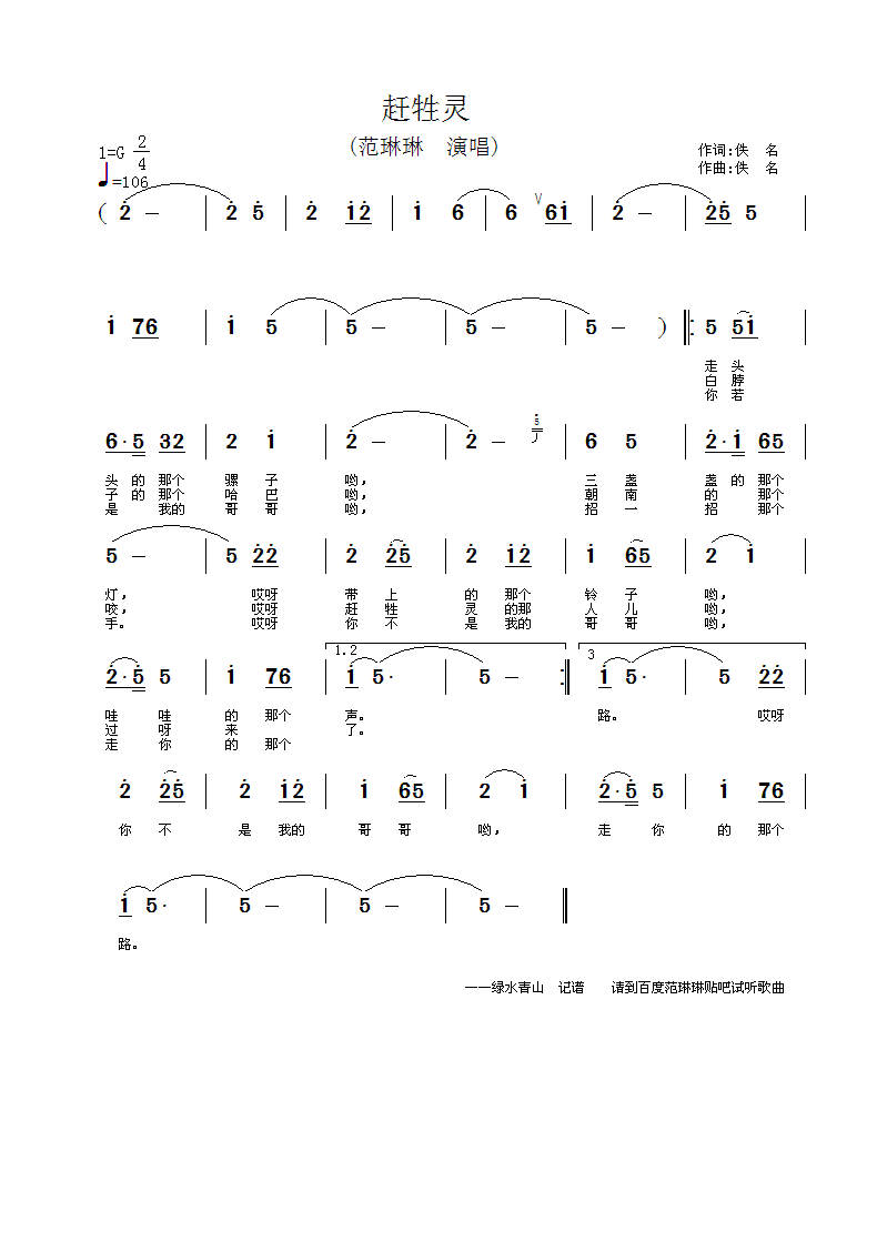赶牲灵 简谱 曲谱