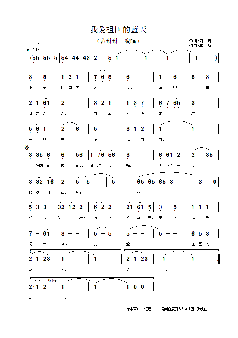 我爱祖国的蓝天 简谱 曲谱