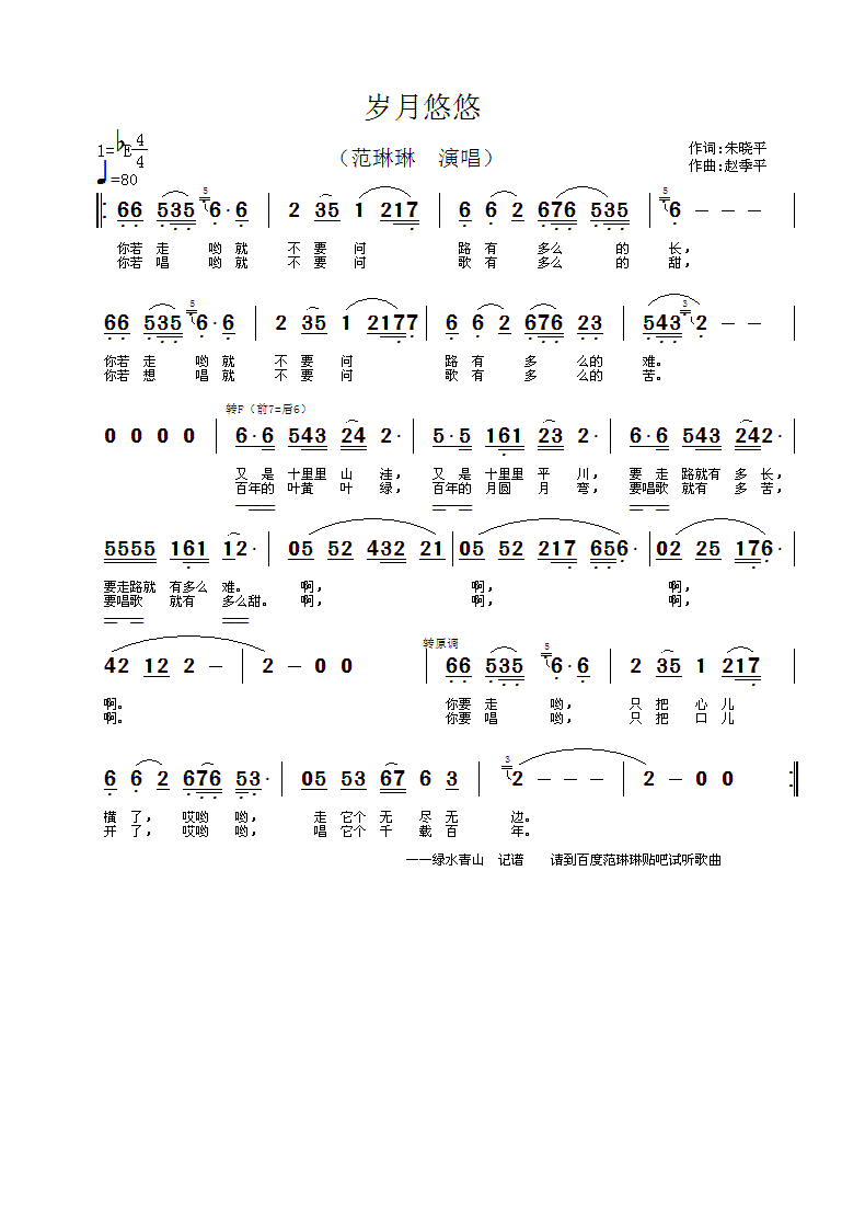 岁月悠悠 简谱 曲谱