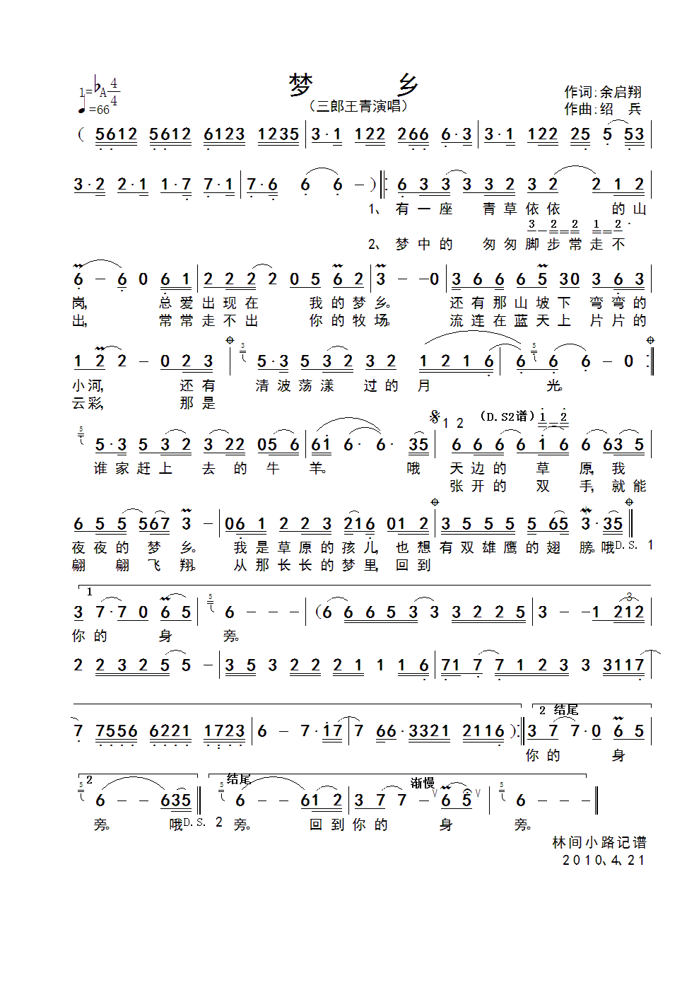 梦乡 简谱 曲谱