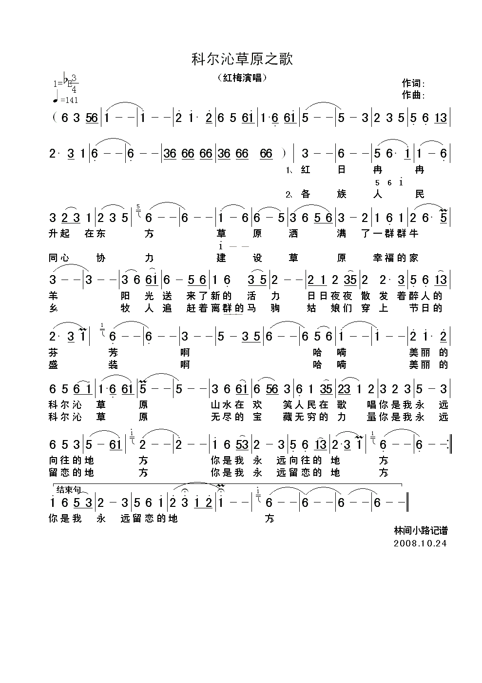科尔沁草原之歌 简谱 曲谱