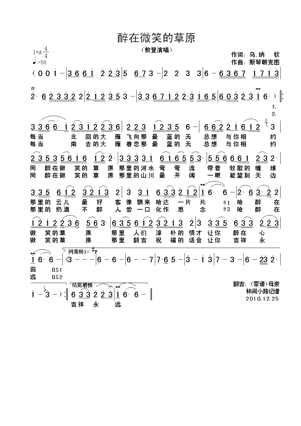 醉在微笑的草原 简谱 曲谱