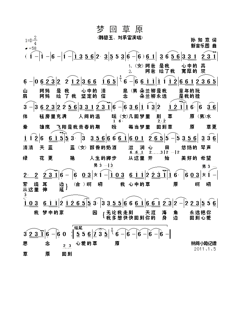 梦回草原 简谱 曲谱