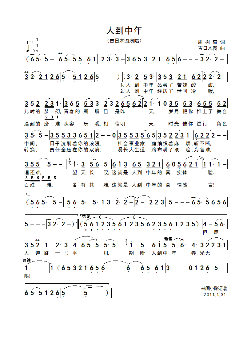 人到中年 简谱 曲谱