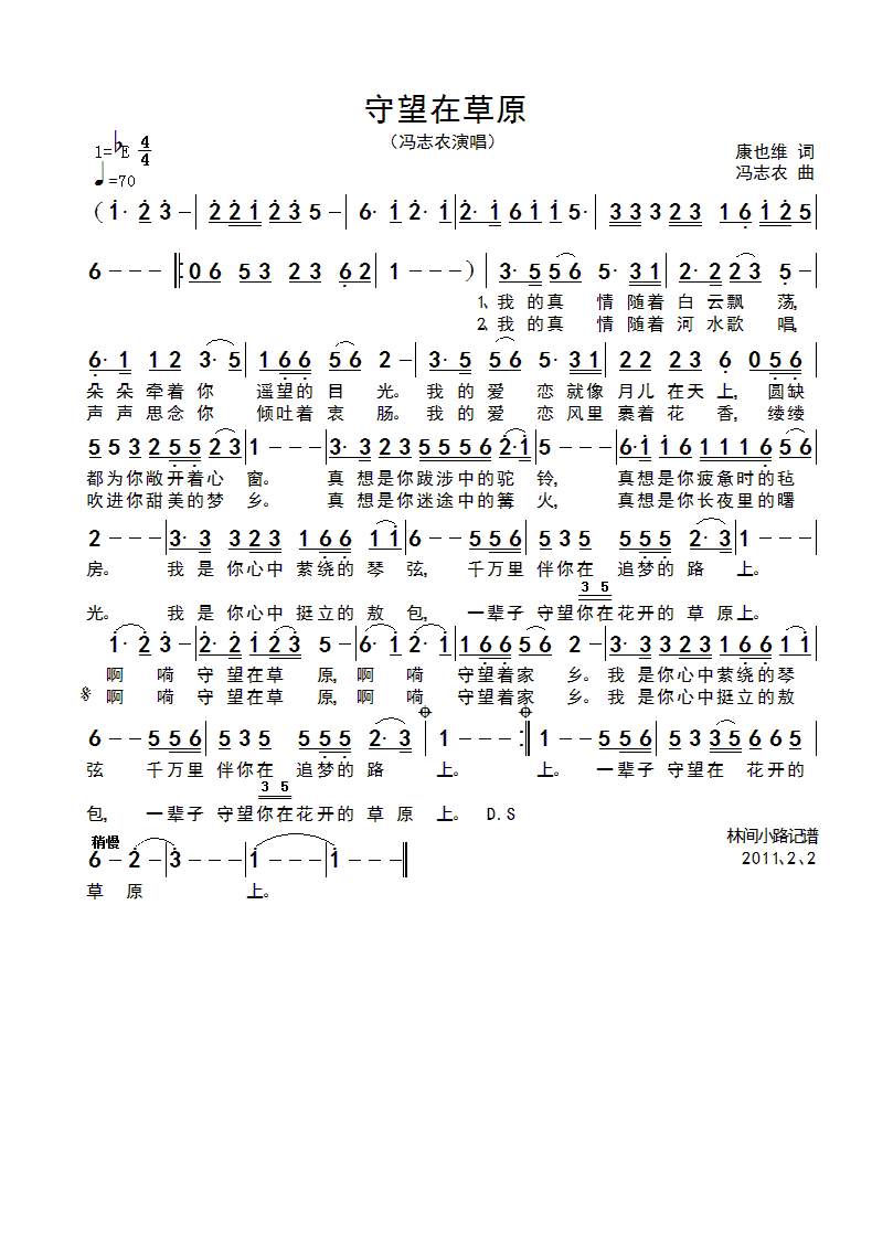 守望在草原 简谱 曲谱