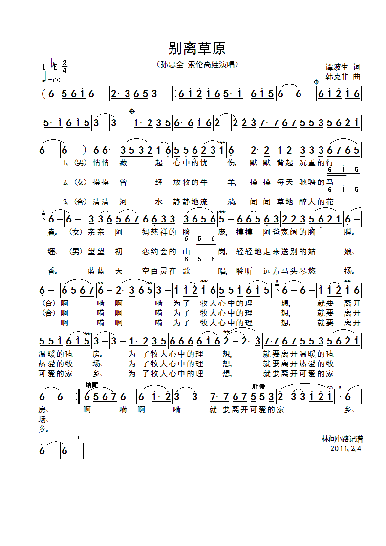别离草原 简谱 曲谱