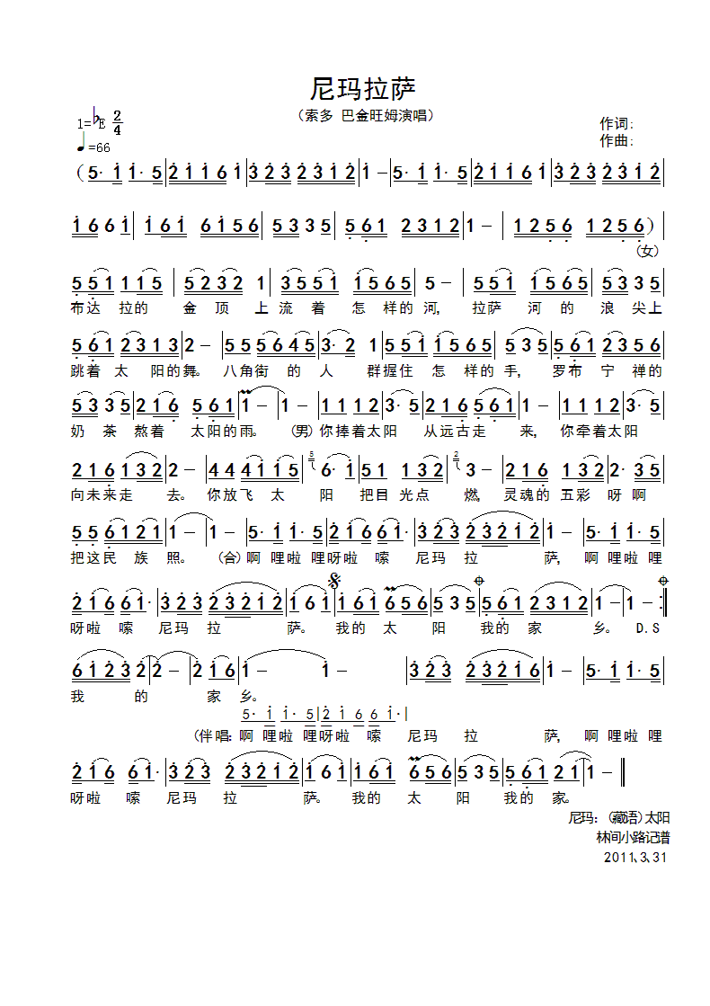 尼玛拉萨 简谱 曲谱