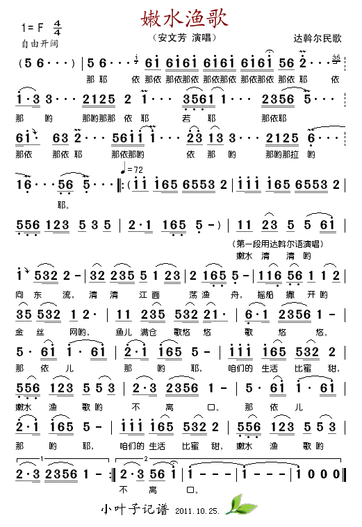 嫩水渔歌 简谱 曲谱