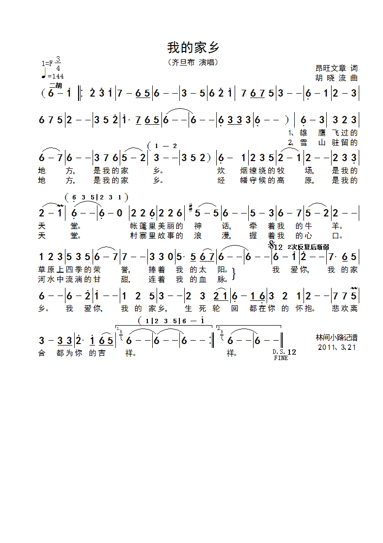 我的家乡 简谱 曲谱