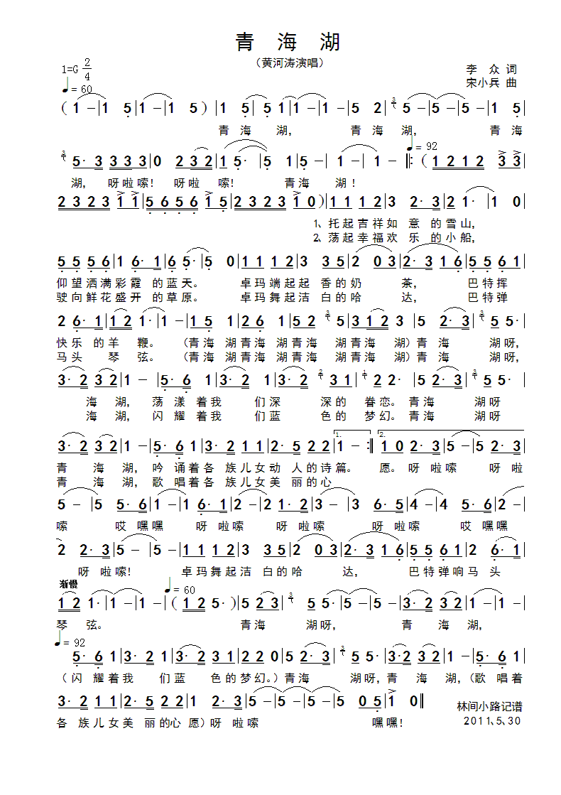 青海湖 简谱 曲谱