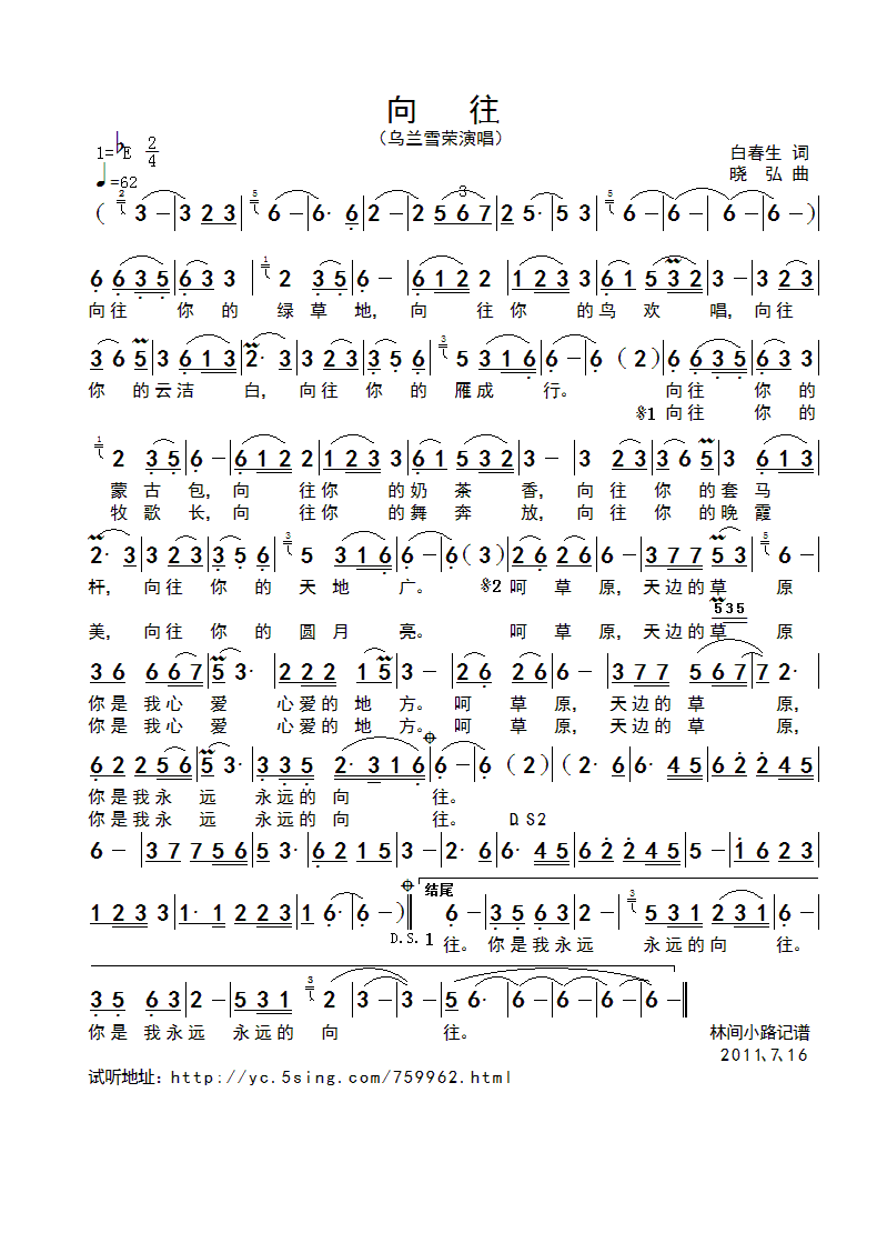 向往 简谱 曲谱