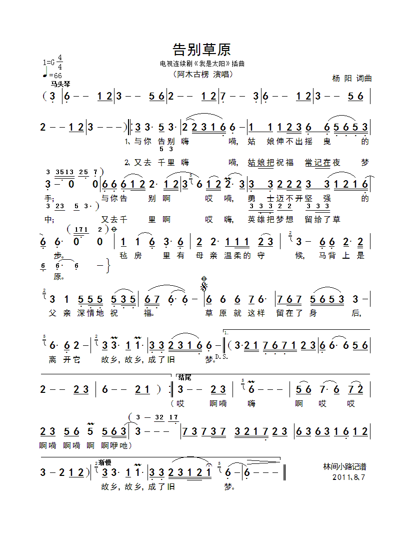 告别草原 简谱 曲谱