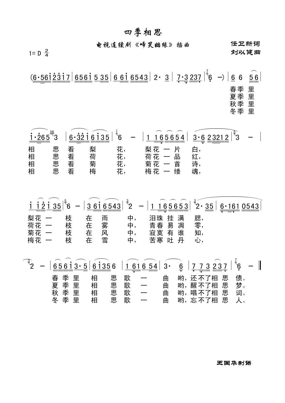 四季相思 简谱 曲谱