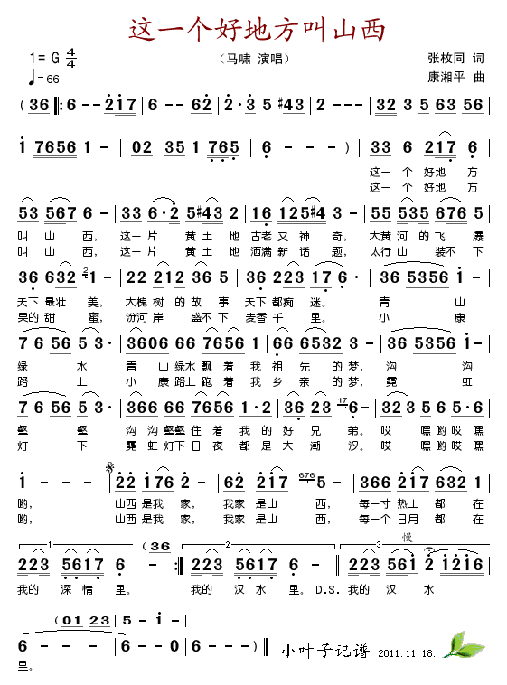 这一个好地方叫山西 简谱 曲谱
