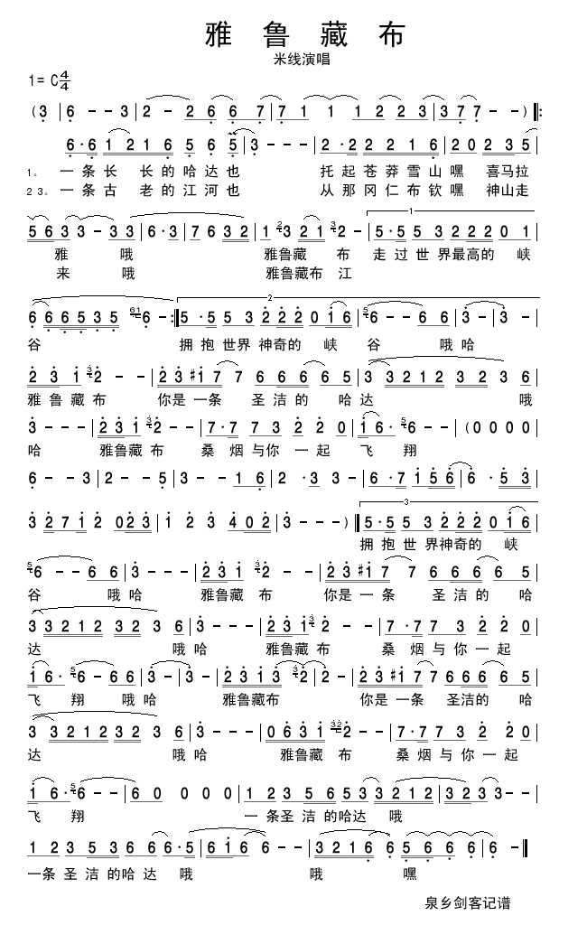 雅鲁藏布 简谱 曲谱