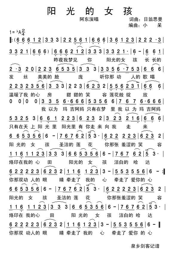 阳光的女孩 简谱 曲谱