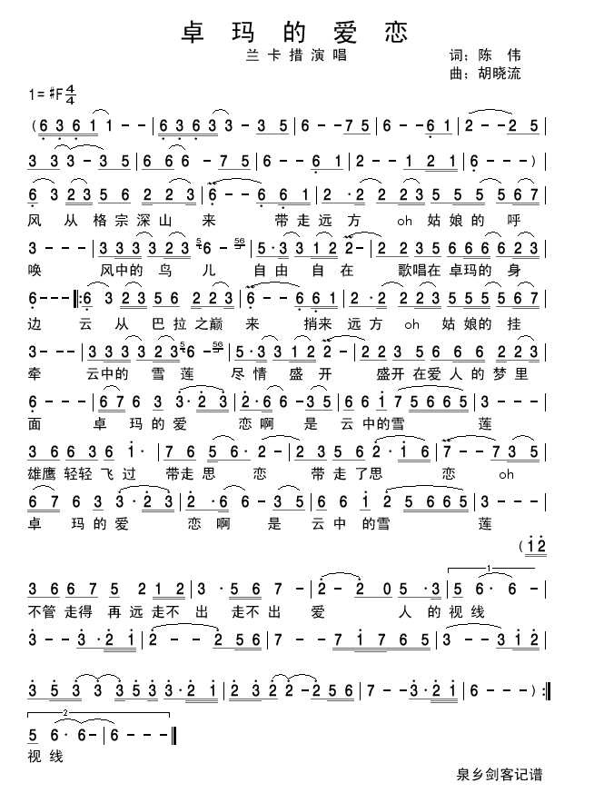 卓玛的爱恋 简谱 曲谱