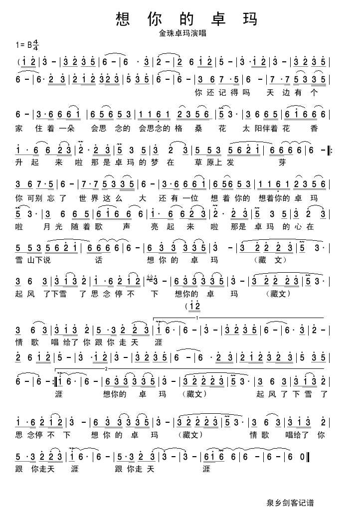 想你的卓玛 简谱 曲谱