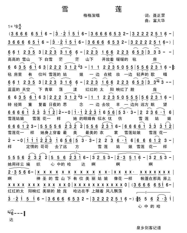 雪莲 简谱 曲谱