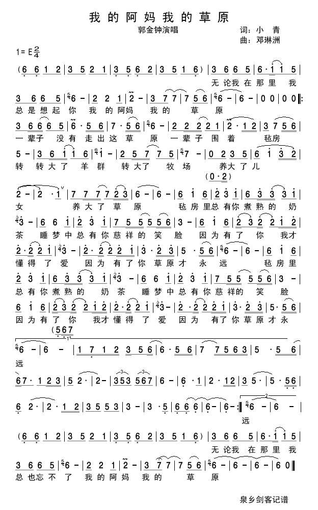 我的草原我的阿妈 简谱 曲谱