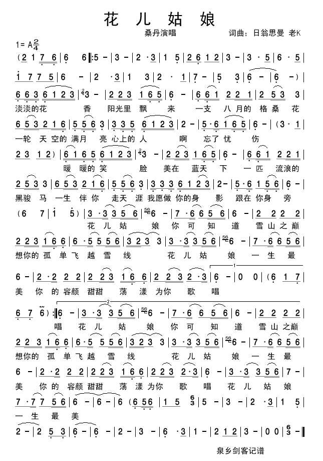 花儿姑娘 简谱 曲谱