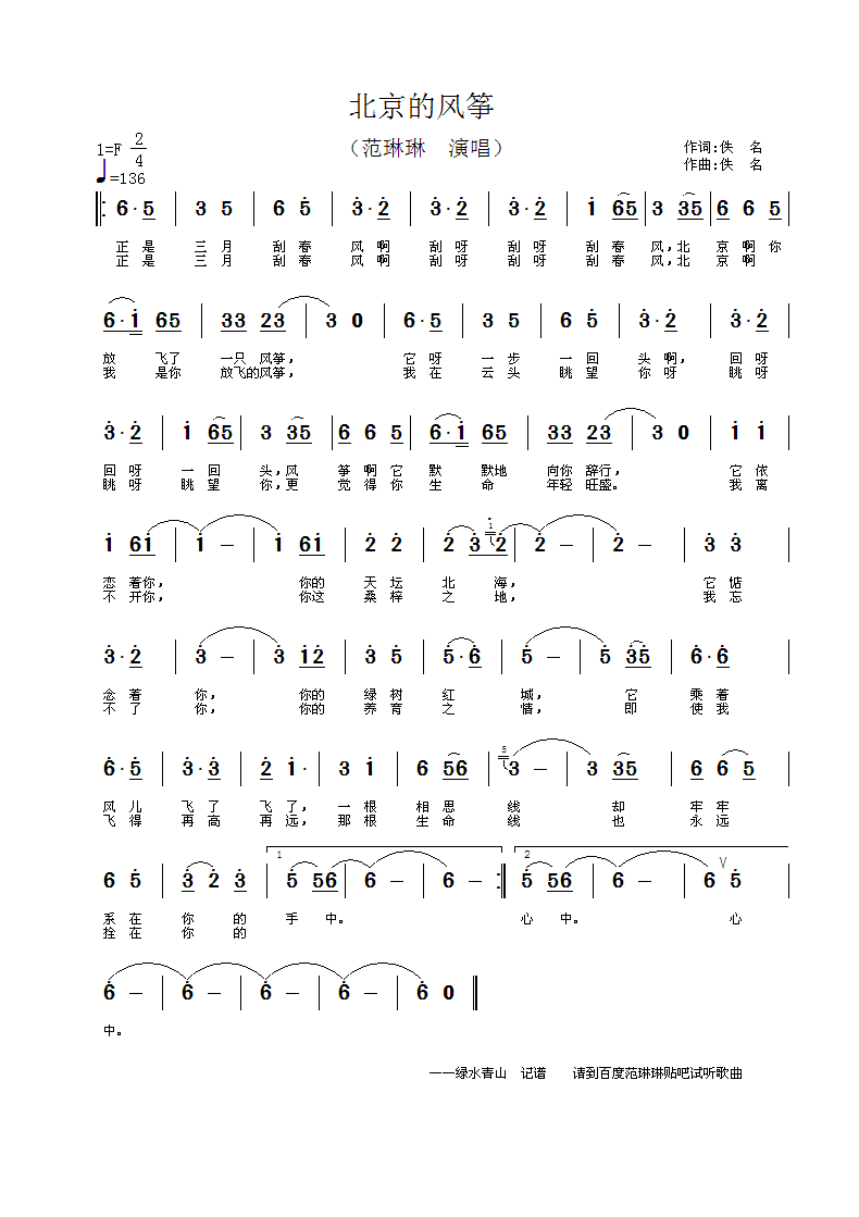 北京的风筝 简谱 曲谱