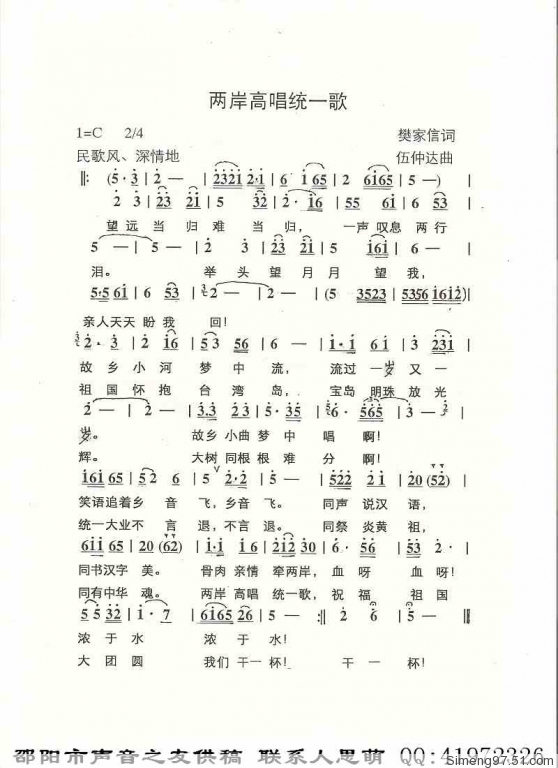 两岸高唱统一歌 简谱 曲谱
