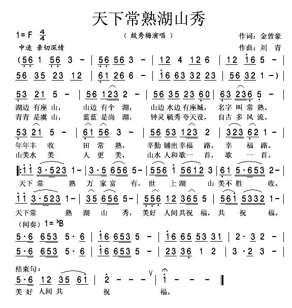 天下常熟湖山秀 简谱 曲谱