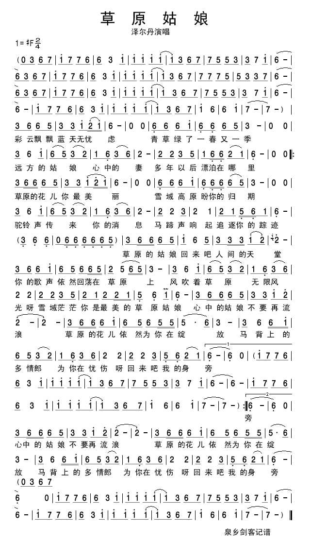 草原姑娘 简谱 曲谱