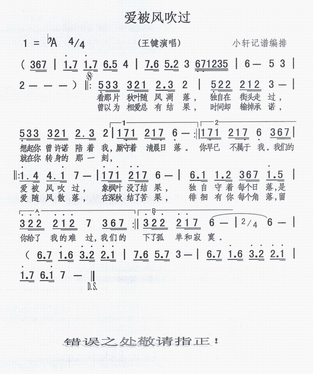 爱被风吹过 简谱 曲谱