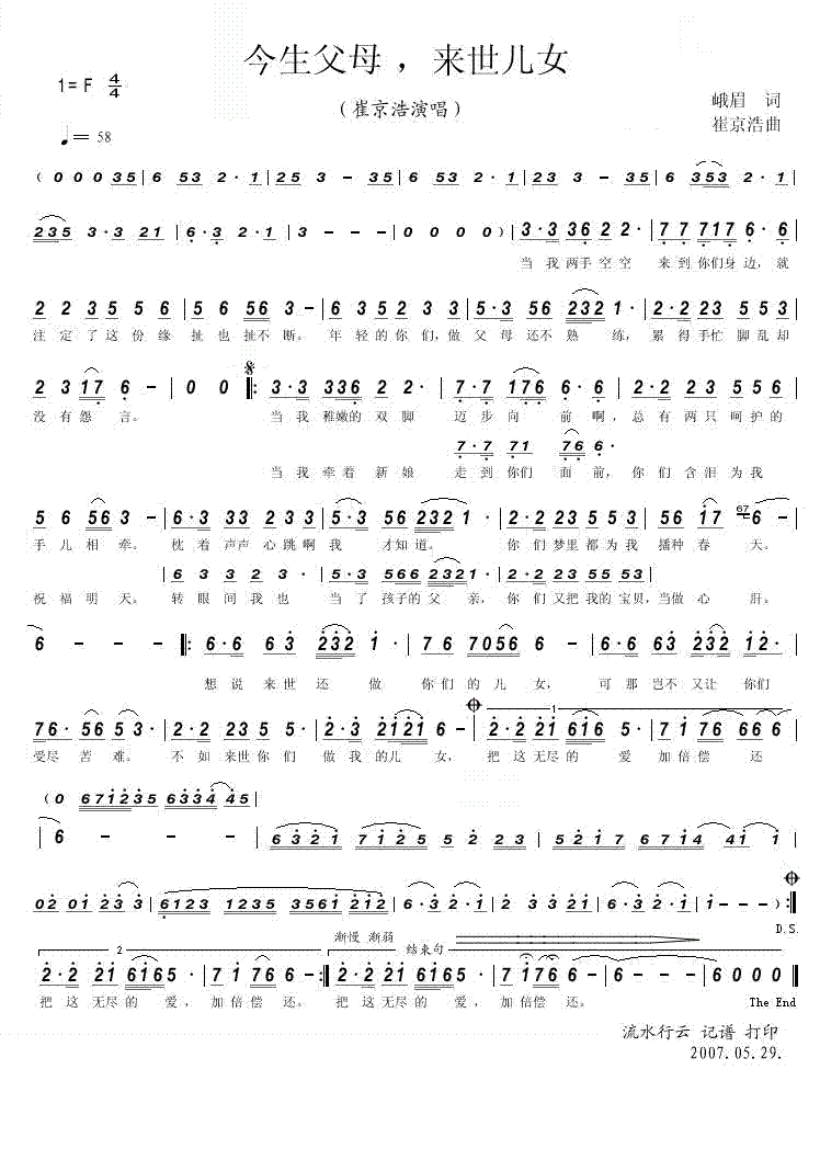 今生父母,来世儿女 简谱 曲谱