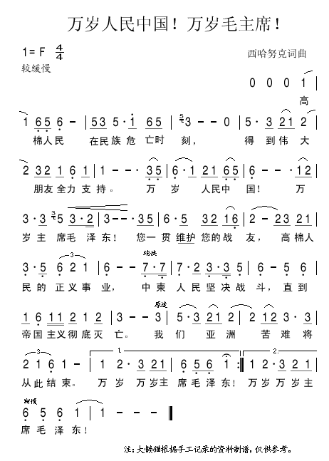 万岁人民中国 万岁毛主席 简谱 曲谱