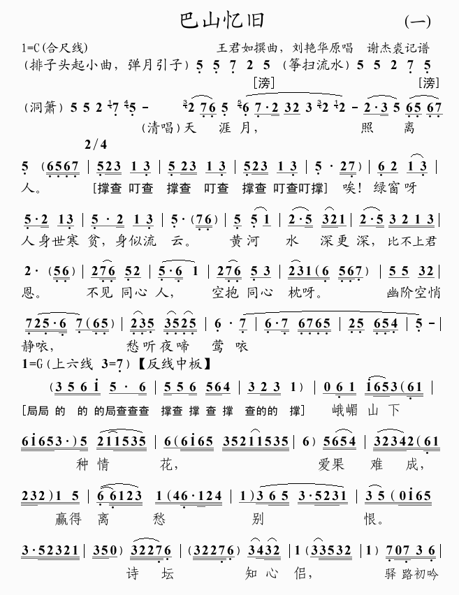巴山忆旧 简谱 曲谱