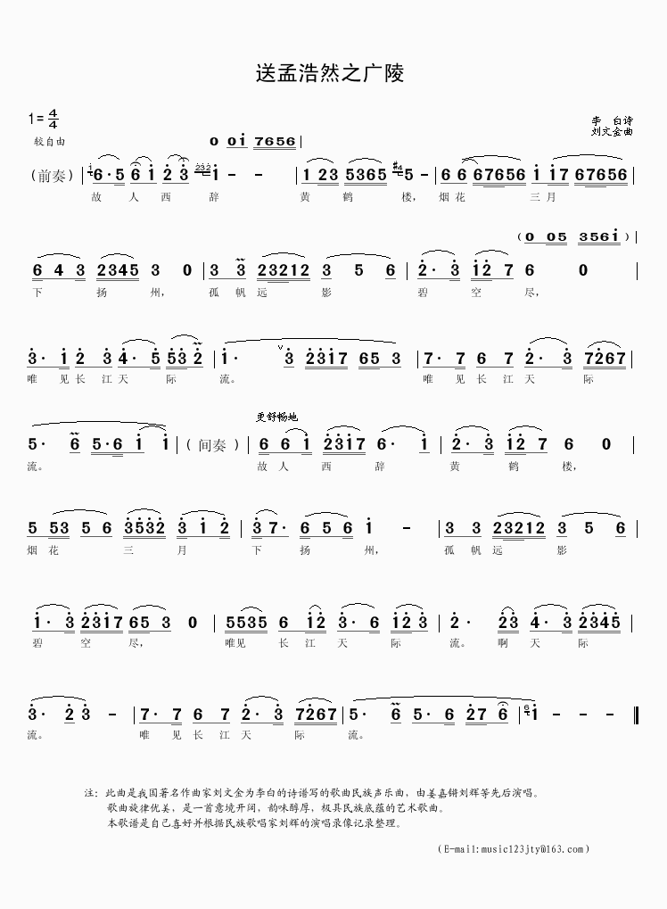 送孟浩然之广陵 简谱 曲谱